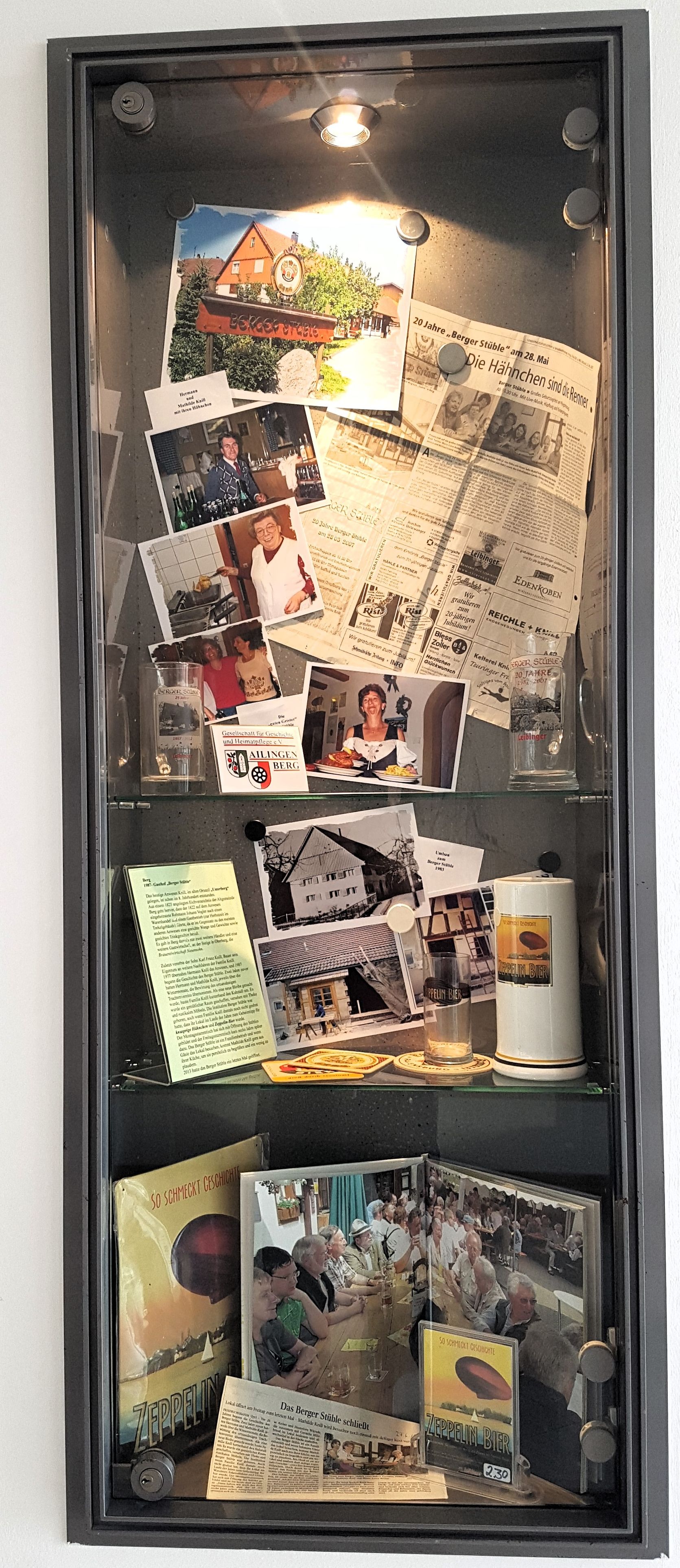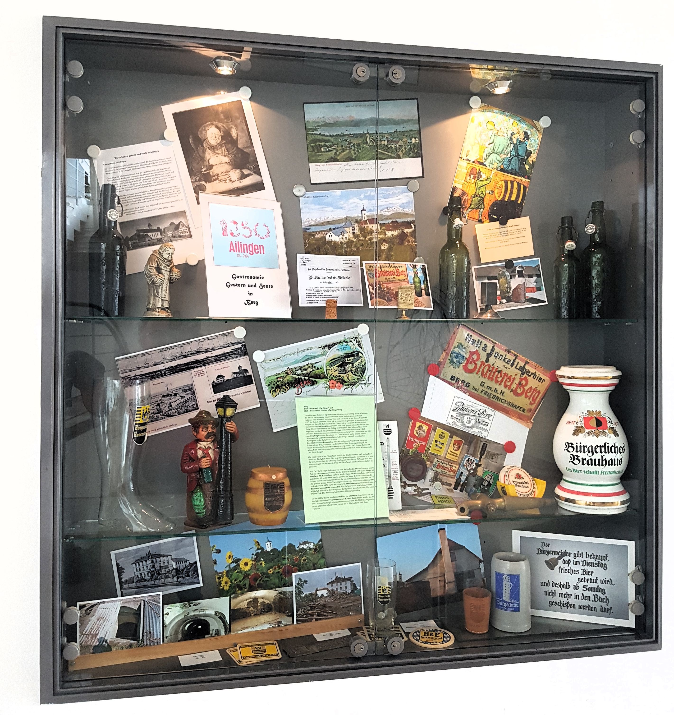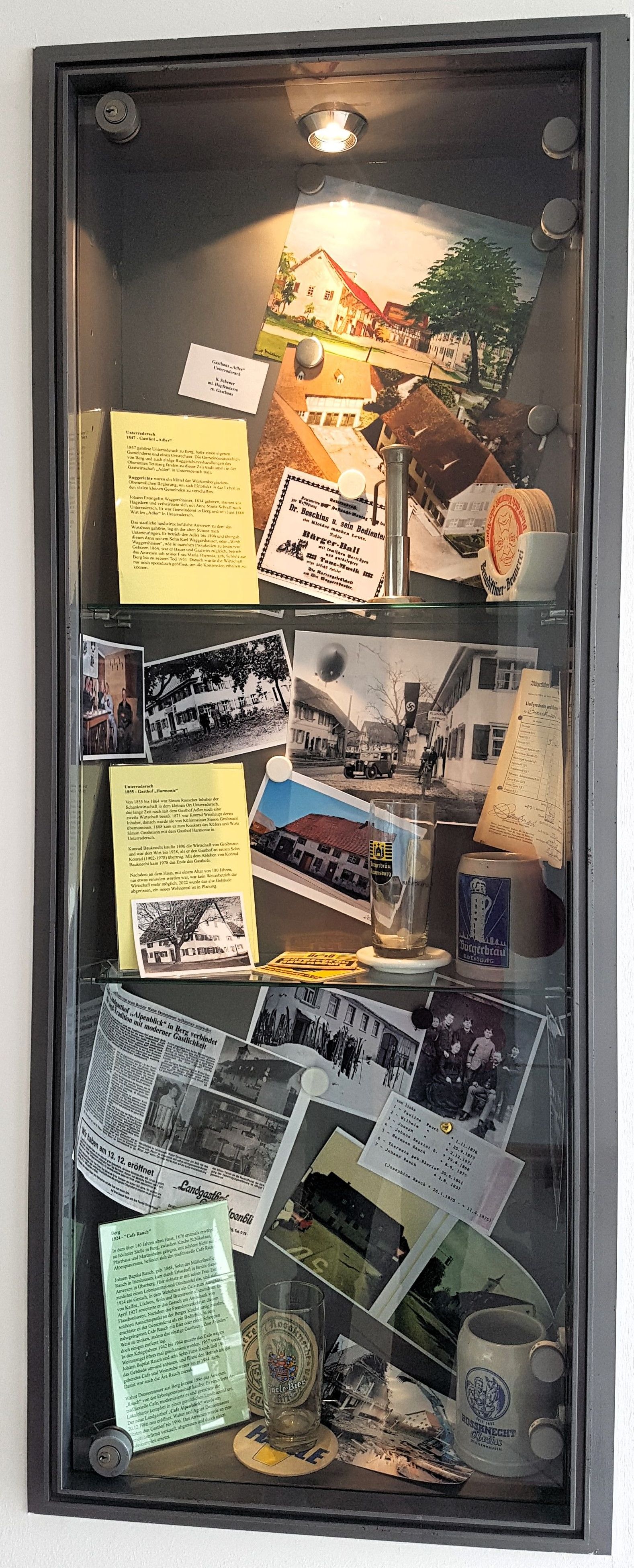 In den Vitrinen im Gemeindehaus Berg werden die Brauerei Berg und die Gasthöfe von Berg und Unterraderach aufgezeigt. In beiden Gemeinden gibt es heute leider kein Gasthaus mehr. Geöffnet zu den Veranstaltungen im Gemeindehaus Berg. (weitere Infos unter Tel.: 07541/41970)